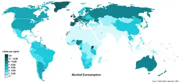 این فهرست کشورها، بر پایه سرانه مصرف الکل (اتیل خالص) در سال است، با توجه به آخرین داده های، سازمان جهانی بهداشت، بر اساس افراد (۱۵ +) محاسبه شدهاست.