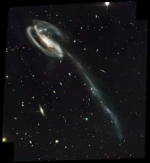 کهکشان بچه قورباغه | اژدها (صورت فلکی) | نامگذاری به دلیل شباهت این کهکشان با بچه قورباغه | این شکل پیامد واکنشهای کشندی است که یک دنبالهٔ بزرگ کشندی را ایجاد کردهاست | |