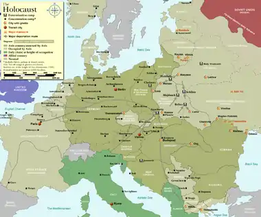 گتوهای نازی بزرگی که در آن یهودیان محدود میشدند در سراسر اروپا وجود داشتند. این گتوها اغلب در جریان انتقال زندانیان توسط قطارهای هولوکاست به اردوگاههای کار اجباری یا مرگ ساخته شده توسط آلمان در لهستان اشغالی برچیده شدند.[1]