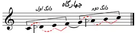 | چهارگاه: دوم نیمبزرگ، سوم بزرگ، چهارم و پنجم درست، ششم نیمبزرگ، هفتم بزرگ، هشتم درست.[62] | |||