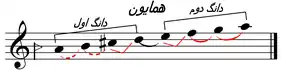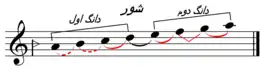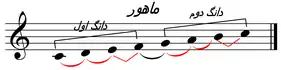 | ماهور: دوم بزرگ، سوم بزرگ، چهارم و پنجم درست، ششم و هفتم بزرگ، هشتم درست.[60] | همایون: دوم نیمبزرگ، سوم بزرگ، چهارم و پنجم درست، ششم و هفتم کوچک، هشتم درست.[61] | ||