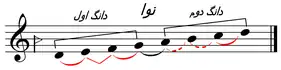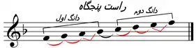 | راستپنجگاه: دوم بزرگ، سوم بزرگ، چهارم و پنجم درست، ششم و هفتم بزرگ، هشتم درست.[58] | نوا: دوم بزرگ، سوم کوچک، چهارم و پنجم درست، ششم نیمبزرگ، هفتم کوچک، هشتم درست.[59] | ||