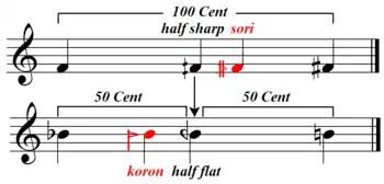 ![]() گام ۲۴ پردهای وزیری، در این مثال وزیری از دو علامت ابداعی خود (سری و کرن) به صورت دقیق به عنوان ربع پرده (نیم بمل و نیم دیز) نام میبرد که برابر با ۵۰ سنت است. وی ادعا میکند برای تغییر و تکامل این سبک و فاصلهها به ۲۴ قسمت، تمدنی بالاتر از تمدن اروپایی لازم است و قصدش حفظ و تناسب دادن موسیقی ایرانی با علم است و هر آنچه نالازم است باید دور ریخته شود.[34] |