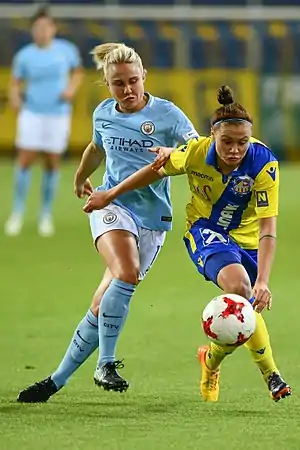 بازیکنان دو تیم فوتبال زنان زانکت پولتن (اتریش) و منچستر سیتی (انگلستان) در چارچوب مسابقات فصل ۲۰۱۷-۱۸ لیگ قهرمانان اروپای زنان در حال رقابت برای تصاحب توپ.