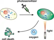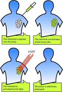 (Photodynamic therapy (PDT یک روش درمانی برای سرطان است که در آن دارویی که به نور حساس است و اصطلاحاً به آن photosensitizer یا photosensitizing agent گفته می شود به بیمار تزریق می شود. این دارو به طول موج خاصی از نور حساس بوده و در زمان تابش آن طول موج به دارو، اکسیژن تولید شده و سلولهای همسایه خود را نابود می کند. البته عمق نفوز طول موجهای مختلف در بدن متفاوت است و برای درمان بخشهای مختلف بدن نیاز به داروها و طول موجهای مختلفی است. این درو در خون تزریق شده و توسط تمامی سلولهای بدن جذب میشود اما در سلولهای سرطانی به دلیل آسیب دیدگی قدد لمفابی در این ناحی، رشد به همریخته و بدونه نظم و پیچیدگی این ناهیهها، اسیدی بودن ناهیه تومور، مدت طولانیتری باقی میماند. بعد از ۲۴ تا ۷۲ ساعت بعد از تزریق، تومور سرطانی تحت تابش نور قرار گرفته و با آزاد شدن اکسیژن فعال از دارو، سلول های تومور کشته می شوند.