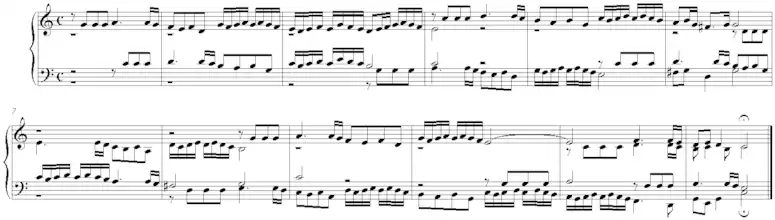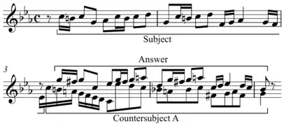 ۲. پس از آن صدای دوم همان ملودی را به عنوان جواب سوژه در دومینانت (پنجم نمایان) میدهد (در این مرحله صدای اول به صورت کنترپوان آزاد، صدای دوم را همراهی میکند) در شیوهای دیگر صدای اول میتواند در یک قالب ثابت و متضاد (کنتر سوژه)[persian-alpha 9] با سوژه اصلی طرحریزی شود و هر بار با سوژه اصلی تکرار شود.[5]