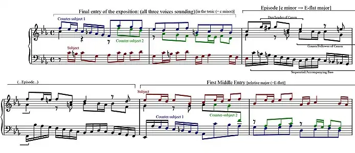 در اینجا بیان اول یا (اکسپوزیسیون) به عنوان مهمترین بخش، پایان میگیرد و سپس با یک قسمت کوتاه یا (اپیزود)[persian-alpha 13] که حالتی متضاد دارد، فوگ وارد مرحله دوم که «بسط و گسترش» سوژهٔ اصلی است میشود و در ادامه، سوژهٔ اصلی بر پایهٔ یک نت پدال تکرار میگردد و به پایان میرسد.[11][12]