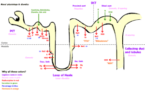 تصویر نشان دهنده فیزیولوژی طبیعی کلیه و همچنین نمایش محل اثر برخی از دیورتیکها و عمل آنها.