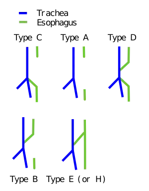 | تیپ E (یا H) | - | ۲٪-۳٪ | نوعی از تیپ D؛ در صورتی که هر دو قسمت پروگزیمال و دیستال مری، بهطور مستقیم نیز با هم ارتباط داشته باشند، به عنوان تیپ E شناخته میشود. به علت شباهت این ساختار به حرف H، به آن تیپ H نیز گفته میشود. این فیستول تراکئوازوفاژیال بدون آترزی مری است. | خیر | بله |