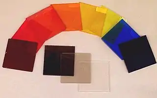 فیلترهای نوری به صورت انتخابی انتقال نور در یک محدوده خاص از طول موچ را دارند که رنگ است در حالی که باقی مانده آنها را بلاک میکند. آنها معمولاً میتوانند طول موجهای بلند (longpass) با طول موج کوتاه (shortpass) یا یک گروه از طول موج را عبور دهند و طول موج طولانیتر و طول موجهای کوتاهتر (میان گذر) را بلاک کنند. passband ممکن است باریکتر یا پهن ترباشد؛ انتقال یا قطع بین حداکثر و حداقل انتقال میتواند تیز یا تدریجی باشد. فیلترهای پیچیدهتر انتقال نور نیز وجود دارند برای مثال با دو قله به جای یک تک باند؛[2] این مطلب معمولاً در طراحی بهطور سنتی مورد استفاده برای عکاسی قرار میگرفت؛ فیلتر با مشخصه منظم تر برای کار علمی یا تکنیکال به کار میروند.