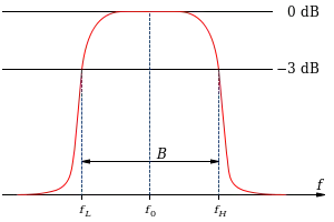 پهنای باند سه دسیبل فیلتر میانگذر با استفاده از نمودار مطلق قدر تابع تبدیل بر حسب فرکانس به این صورت محاسبه میشود که فرکانسهایی را مییابیم که تابع انتقال به نیمی از توانش یا حدود ۰٫۷۰۷ اوجش رسیده باشد.
