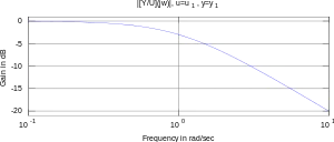 با استفاده از نمودارهای اندازه تابع تبدیل تشخیص یک فیلتر پایین گذر به راحتی انجام پذیر است. شکل روبرو نمودار اندازه تابع تبدیل مدار بخش پیشین میباشد (). به روشنی میتوان دید که برای فرکانسهایی بزرگتر از یک فرکانس مشخص، اندازه تابع تبدیل به صفر میل میکند.
