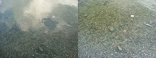 عکس سمت راست بدون استفاده از فیلتر است و در عکس سمت چپ از فیلتر پولارایزر استفاده شده که پرتوهای بازتابیده را حذف نمودهاست.
