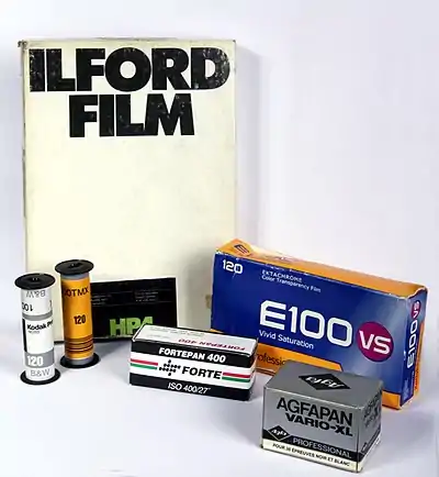 ۲- فیلم ۱۲۰ برای ضبط تصاویر در اندازههای ۶*۴٫۵، ۶*۶، ۶*۹ و ۶*۱۷ برای دوربین قطع متوسط.