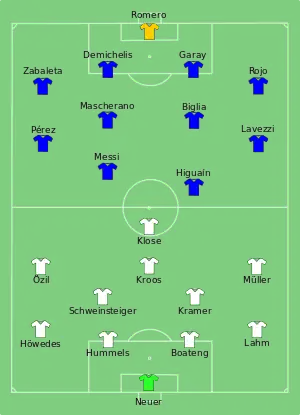 این دیدار با قضاوت نیکولا ریتزولی و محمد رضا جهانشیری انجام شده است با نتیجه یک بر صفر به سود آلمان به پایان رسیده است، گل تیم ملی فوتبال آلمان توسط ماریو گوتزه در دقیقه ۱۱۳ به ثمر رسیده است.