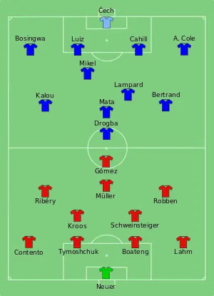 این دیدار در تاریخ ۱۹ مه ۲۰۱۲ با قضاوت پدرو پروئنکا[2] در ورزشگاه آلیانتس آرنا شهر مونیخ انجام شده که دو تیم در پایان ۹۰ دقیقه و گذراندن وقتهای اضافه به نتیجه مساوی یک بر یک رسیدند، در ضربات پنالتی تیم چلسی توانست با نتیجه ۴ بر ۳ به پیروزی برسد و موفق شد به اولین عنوان قهرمانی خود در لیگ قهرمانان اروپا دست یابد.