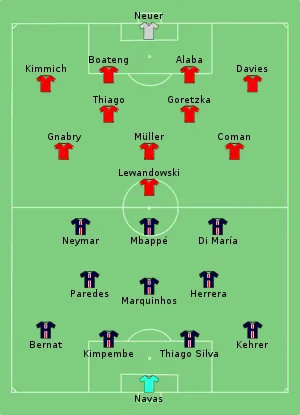 هر تیم پس از نیمهنهایی یک تغییر در ترکیب اصلی خود ایجاد کرد. پس از رهایی از مصدومیت، کیلور ناواس دروازهبان انتخابی پاری سن ژرمن به جای سرخیو ریکو برای ترکیب اولیه بود. سرمربی بایرن مونیخ، هانس دیتر فلیک تصمیم گرفت در پست وینگ چپ، کینگزلی کومان پاریسی را جایگزین ایوان پریشیچ کند، که در سه مسابقه قبلی لیگ قهرمانان جزء ترکیب اصلی بود. ژروم بواتنگ، مدافع میانی بایرن نیز که در نیمهنهایی به دنبال مصدومیت جزئی مجبور به تعویض در بین دو نیمه شد، آماده بازی بود.[68]