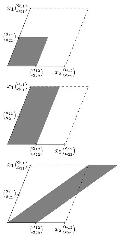 مساحت متوازیالاضلاعهایی که از روابط و بدست میآیند، را میتوان از دترمینان دستگاه معادلات بدست آورد: