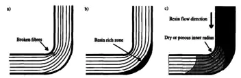 گوشههای تیز در همه فرایندهای ساختی که با قالب سروکار دارند، خصوصاً ریختهگری، ایجاد مشکل میکنند. در قالبگیری انتقالی گوشهها میتوانند الیاف داخل قالب را میشکنند و در گوشهها فضای خالی ایجاد میکنند. این پدیده در سمت راست شکل بالا نشان داده شدهاست. محدودیتی که در طراحی این قالب وجود دارد، شعاع انحنا گوشه داخلی آن است که در نتیجه آن، انتخاب الیاف و رزین مورد استفاده را نیز محدود کردهاست اما طبق یک قانون نانوشته شعاع انحنا باید ۳ تا ۵ برابر ضخامت ورقه باشد.[8]