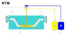 قالبگیری انتقالی رزین (RTM) رزین ترموست مایع را به منظور آغشته کردن ماده شکل گرفته در قالب استفاده میکند. این فرایند تطبیق پذیر است، به طوری که ماده مورد استفاده را میتوان با فوم یا ترکیبات دیگر به جای الیاف پیش شکل (fiber preform) جایگزین کرد.[4]