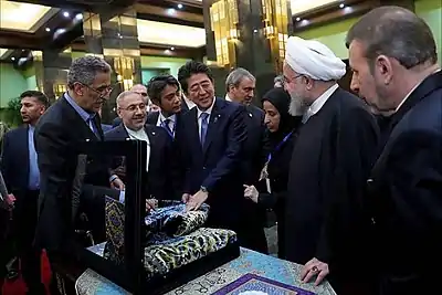 در جریان سفر شینزو آبه به ایران در خرداد ۱۳۹۸ و در دیدار با حسن روحانی، رئیسجمهور ایران، یک تخته قالی نفیس ابریشم قم به او اهدا شد. این قالی مربع با ابعاد ۲۰۵×۲۰۵ سانتیمتر با بیش از ۴ میلیون گره از محصولات کارگاه قالیبافی حسین ارمی است.[4]