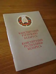 نسخه ای از قانون اساسی که از طرف دولت برای شهروندان منتشر شده است. نام سند به زبان بلاروسی و روسی درج شده است.
