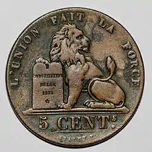 تصویر قانون اساسی بلژیک بر روی سکه بلژیکی که توسط شیر بلژیکی محافظت میشود.