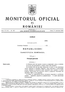 ![]() صفحه اول قانون اساسی کنونی رومانی پس از اصلاح قانون در ۱۸ اکتبر ۲۰۰۳ | |