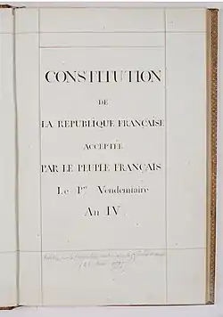 قانون اساسی ۱۷۹۵ ۲۲ اوت فرانسه در طول انقلاب فرانسه بود که به تصویب قانون اساسی ۱۷۹۵ انجامید و در ۲ نوامبر ۱۷۹۵ دیرکتوار فرانسه تشکیل شد. این قانون اساسی تا کودتای ۹ نوامبر ۱۷۹۹ با پیروزی ناپلئون بناپارت پا بر جا بود و با پیروزی ناپلئون بناپارت به پایان رسید. بر اساس قانون اساسی ۱۷۹۵ فرانسه، نظام کشور یک جمهوری لیبرال با حق رای دادن بر اساس پرداخت مالیات میباشد.[1][2]