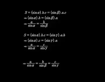 که a و b و c به ترتیب ضلعهای مثلث و و و به ترتیب زاویههای مقابل به هر ضلعاند. هنگامی که دو زاویه و یک ضلع مثلث را داشته باشیم از قانون سینوسها استفاده میکنیم تا طول ضلعهای دیگر مثلث را بدست آوریم.