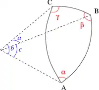 در حالتی که یک مثلث کروی داشته باشیم، اندازهٔ a و b و c برابر است با اندازهٔ زاویهٔ مقابل به کمانهای بزرگ [BC] و [AC] و [AB] (شکل روبرو).