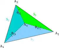 چهاروجهی A۱A۲A۳A۴ را در فضای اقلیدوسی در نظر بگیرید. در شکل مقابل اطلاعات مربوط به زاویهها و ضلع مقابل به هر گوشه نشان داده شدهاست: