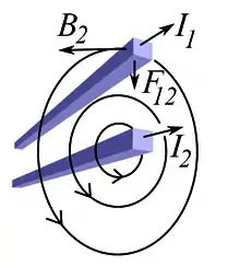 - نیروی کل واردشده بر سیم ۱ از طرف سیم ۲ است (معمولاً بر حسب نیوتون اندازهگیری میشود)،