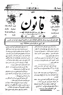 قانون نشریهای است فارسیزبان که میرزا ملکم خان ناظمالدوله نخستین شماره آن را در اول رجب سال ۱۳۰۷ هجری قمری در لندن منتشر کرد.[1] از این روزنامه امروز ۴۱ شماره به جا ماندهاست. ملکم خود میگفت که چهل پنجاه شماره منتشر کردهاست.[2] این روزنامه به نظام حکومتی قاجار با لحنی تند انتقاداتی وارد میکرد. این نظام را استبدادی میدانست و معتقد بود باید سیستم حکومتی تغییر کند.[3] به همین دلیل انتشار این روزنامه با محدودیتهایی از سوی دولت وقت مواجه بود.[4] بیشتر خوانندگان قانون از فارغالتحصیلان و محصلان دارالفنون بودند.[4]