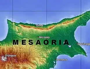 در جزیره قبرس دو رشتهکوه اصلی خودنمایی میکنند، کوهستان ترودوس و کوهستان کوچکتر کیرنیا. دشت مرکزی میان این رشتهکوه، مسائوریا نام دارد. این دشت توسط رودخانه پدیهئوس آبیاری میشود که طولانیتر رود جزیره نیز هست. کوههای ترودوس بیشتر مناطق جنوب و غربی قبرس را دربر میگیرند و کمابیش نیمی از جزیره در اختیار این کوهستان است. بلندترین نقطه در قبرس کوه الیمپوس است که در مرکز کوهستان ترودوس واقع شده و ۱۹۵۲ متر ارتفاع دارد. کوهستان کمپهناتر کیرنیا که در امتداد کرانههای شمالی جزیره قرار گرفته به نسبت ترودوس مساحت بسیار کمتری را اشغال کرده و بلندیهای آن نیز کمارتفاعترند. بلندترین نقطه کیرنیا ۱۰۲۴ متر بالاتر از سطح دریا است. جزیره قبرس از نظر زمینشناختی بخشی از صفحه آناتولی بهشمار میآید.[12]