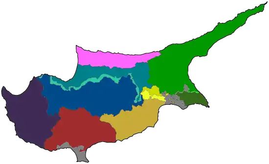 جمهوری قبرس به شش استان تقسیم شدهاست. نام این استانها فاماگوستا، گیرنه، لارناکا، لیماسول، نیکوزیا، و پافوس است.[14]