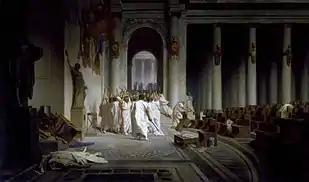 مرگ سزار اثر ژان لئون ژروم که صحنهٔ پس از قتل سزار را به تصویر کشیدهاست و در آن سناتورها پس از به قتل رساندن سزار با شادی و شعف جسد وی را ترک میکنند.