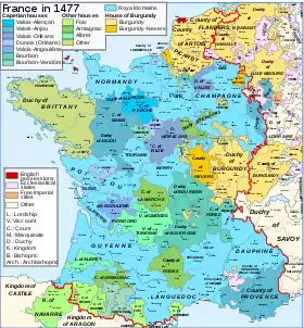 خاندان فرانسوی والوا، که در پی دودمان کاپتی در ۱۳۲۸ بر سر کار آمدند، آنها در آغاز در کشور خود به حاشیه رانده شده بودند، نخست توسط نیروهای مهاجم انگلیسی در جنگ صد ساله، و سپس از سوی قلمرو دوکنشین قدرتمند بورگونی در تنگنا بودند.[23] ظهور ژاندارک به عنوان یک رهبر نظامی این دوره جنگ را به نفع فرانسه تغییر داد و ابتکار عمل بیشتری در پی آن توسط پادشاه لویی یازدهم انجام گرفت.[24]