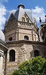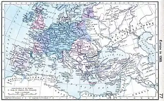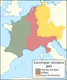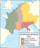 درپی مرگ او سه سال جنگ داخلی درگرفت. در پیمان وردون (۸۵۳)، یک پادشاهی در سرزمینهای میان رودهای راین و رون برای لوتار ایجاد گردید و همراه با سرزمینهایش در ایتالیا به او تعلق گرفت و عنوان امپراتوریاش نیز به رسمیت شناخته گردید. لویی ژرمن کنترل باوریا و مناطق شرقی آلمان امروزی را بدست گرفت. شارل تاس سرزمینهای فرانک غربی و آنچه که امروزه فرانسه خوانده میشود، را دریافت کرد.[84] همهٔ نوهها و نتیجههای شارلمانی بر طبق سنت سرزمینهایشان را میان فرزندانشان تقسیم کردند که نتیجهٔ آن از بین رفتن انسجام و یکپارچگی خاندان گردید.[85][upper-alpha 9] در سال ۹۸۷ میلادی و در سرزمینهای غربی خاندان کارولنژی با تاجگذاری هوگو کاپه (درقدرت ۹۸۷–۹۹۶) به عنوان پادشاه از میان رفت. این خاندان در سرزمینهای شرقی خیلی زودتر از میان رفته بود، هنگامی که در سال ۹۱۱ لویی بچه درگذشت،[87] و کنراد یکم (درقدرت ۹۱۱–۹۱۸) به عنوان پادشاه بر تخت تکیه زد.[88]