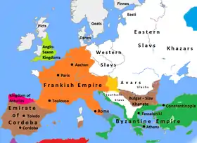 در میان سدههای ششم و هفتم، پادشاهی فرانکها در شمال سرزمین گل شامل سه پادشاهی به نامهای اوسترازیا، نوستریا و بورگوندی میگردید، که همهٔ آنان تحت فرمانروایی خاندان مروونژی قرار داشت که همگی آنان از جانشینان و وارثان تاج و تخت کلوویس یکم محسوب میگردیدند. سدهٔ هفتم دورانی آشفته از جنگهای میان اوسترازیاییها و نوستریاییها بود.[71] این نبردها باعث قدرتگیری پپن یکم (درگذشتهٔ ۶۴۰ م) و تبدیل شدن او به عنوان شهردار کاخ و خوانسالار بزرگ اوسترازیا گردید و قدرت او تا آنجا افزایش یافت که به قدرتمندترین نیروی پشت تاجوتخت اوسترازیا بدل شد. پس از او، فرزندانش در این جایگاه قرار گرفتند و برای مدتها عنوانهای نمایندگی پادشاه و مشاوران او را در اختیار داشتند. یکی از نوادگان او، شارل مارتل (درگذشتهٔ ۷۴۱) توانست در سال ۷۳۱ سپاه مسلمانانی را که از رشتهکوه پیرنه گذر کردهبودند را در نبرد تور درهم بکوبد.[72][upper-alpha 7] بریتانیای کبیر به ایالتهای کوچکی تقسیم شدهبود که بیشتر آنها زیر فرمانروایی پادشاهیهای نورثامبریا، مرسیا، وسکس و آنگلیای شرقی قرار داشتند. اینان همگی از نسل فرزندان مهاجمان انگلوساکسون بهشمار میآمدند اما همچنان پادشاهیهای کوچکتری که امروزه ولز و اسکاتلند نامیده میشوند در کنترل بریتونهای محلی و پیکتها باقی ماندند.[74] ایرلند نیز به واحدهای سیاسی بسیار کوچکتری تکهتکه شدهبود که اغلب به عنوان پادشاهیهای قبایلی شناخته شدهاند و به وسیلهٔ پادشاهان اداره میگردیدند. تخمین زده میشود که در حدود ۱۵۰ پادشاه با درجه اهمیتها و میزان قدرتهای مختلفی در ایرلند حکومت میکردند.[75]