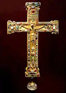 کارهای هنری کارولینگین برای گروه کوچکی از چهرههای وابسته به دربار و صومعهها و کلیساهایی که از آنها پشتیبانی میکردند، تولید شد. هنرمندان این رشته تلاشهایی برای بازگرداندن کرامت و کلاسیکگرایی هنر پادشاهی روم و هنر بیزانسی انجام دادند، اما با این وجود تحت تأثیر هنر خاص جزایر بریتانیا قرار داشتند. تعصب به هنر وطنی، کار برای سبکهای زینتی ایرلندی سلتی و انگلوساکسون و اشکال مدیترانهای مانند کتاب را یکپارچه کرد و معیارهای هنری بسیاری را برای بقیه دوره قرون وسطا به وجود آورد. آثار مذهبی باقیمانده از قرون اولیه، اغلب نسخههای تذهیب یا عاجهای کندهکاری شدهای بودند که در اصل برای فلز ساخته شده بود که از آن زمان ذوب میشد.[133][134] اشیاء ساخته شده از فلزات گرانبها معتبرترین اشکال هنری بودند، اما تقریباً همه آنها به جز چند صلیب مانند صلیب لوتِر، چند مورد یادگاردان، و آثاری مانند تدفین آنگلوساکسون در ساتون هو و دفینههای گوردون از سلسله مروونژیها در فرانسه، جواهرات کوارازار ویزیگوتهای اسپانیا و ناگیزنتمیکلوس در نزدیکی قلمرو بیزانس، مفقود شدهاند. مواردی که همچنان باقی ماندهاند ازجمله سنجاق سینه، سنجاق روی شانه یا سنجاقهای قلمی، مانند سنجاق سینه تارا – منسوب به منطقه تارا در ایرلند - هستند که هر کدام جزئی اصلی از زینت و آراستگی فردی برجستگان آن دوران بود.[135] کتابهای بسیار تزئین شده که بیشترشان کتابهای مذهبی و انجیل بودند به تعداد زیاد باقی ماندهاند، که کتاب کیلز و انجیل لیندیسفارن از آن جمله هستند. همچنین نسخههای معدودی از کتاب انجیل سنت امرام از قرن نهم نیز باقی مانده که جلدی ساخته شده از طلا و جواهر دارد.[136] مجسمههای یادبود بزرگ مربوط به هنر مسیحی نیز بنظر میرسد در دربار شارلمانی پرداخته شدهاند.[137] وهمچنین مجسمههایی از پایان این دوره باقی ماندهاند مانند مجسمه بزرگ به صلیب کشیدن مسیح که بنام اسقف جیرو، اسقف اعظم کلن، که آنرا به آلمان برد به صلیب جیرو معروف شدهاست.[138]