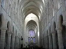 در ساختمانسازیهای اوایل قرن دوازدهم میلادی، در فرانسه، معماری گوتیک توسعه یافت. این سبک از طاقهای دنده دنده، کریدورهای مدور، بادگیرهای عقبی، و پنجرههای بزرگ با شیشههای رنگی ویترا استفاده میکرد. این سبک تا قرن شانزدهم عمدتاً در کلیساهای کوچک و بزرگ اروپا استفاده میشد. نمونههای کلاسیک معماری گوتیک ار جمله کلیسای جامع شارتر و کلیسای جامع رنس در فرانسه و کلیسای جامع سالزبری در انگلستان میباشند. شیشه رنگی به یک عنصر مهم در طراحی کلیساهایی تبدیل شد که همچنان از نقاشیهای دیواری گسترده استفاده میکردند، که اکنون تقریباً همه از بین رفتهاند.[212]