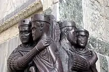 برای حل بحران سده سوم، امپراتور دیوکلسین (۲۸۴–۳۰۵ در قدرت)، امپراتوری را در سال ۲۸۶ به دو بخش اداری و اجرایی نیمه شرقی و نیمه غربی تقسیم کرد؛ اما این تقسیمبندی به وسیلهٔ ساکنان و فرمانروایان این بخش ها به در نظر گرفته نمیشد از آنجایی که تمامی فرمانهای قانونی و اجرایی یک بخش در بخش دیگر نیز معتبر شناخته میشد.[25][upper-alpha 3] اصلاحات دیوکلیسین بدون اینکه منجر به جنگ داخلی گردد، دیوانسالاری حکومتی را تقویت کرد، سیستم مالیاتی را اصلاح کرد و سپاه امپراتوری را قدرتمندتر کرد، این اصلاحات برای دوام امپراتوری زمان بیشتری فراهم کرد اما نتوانست مشکلاتی که پیش روی امپراتوری قرار میگرفت را حل نماید؛ از این مشکلات میتوان به این موارد اشاره کرد: مالیاتهای سنگین، کاهش میزان زادوولد، و فشار بر روی مرزهای امپراتوری و ….[26] در سال ۳۳۰ م و پس از دورهٔ جنگهای داخلی، کنستانتین بزرگ (۳۰۶–۳۳۷ در قدرت) شهر بیزانتیوم را به عنوان پایتخت قسمت شرقی و نام تازهٔ کُنستانتینوپول بنیان نهاد.[27] جنگ و درگیری داخلی میان امپراتورهای رقیب به کاری رایج در میان سده چهارم میلادی بدل شده بود و باعث گشت تا سربازان و نیروهایی که باید در مرزهای امپراتوری بهسر میبردند، سرگرم این کار گردنند و دست متجاوزان و صحرانشینان افزایش مهاجم برای حملاتشان باز شود.[28] در بیشتر سده چهارم میلادی جامعه رومی، بر گونهٔ تازهای که با مدل دوران باستان متفاوت بود، استوار گردید و باعث افزایش شکاف طبقاتی میان ثروتمند و فقیر و همچنین کاهش و زوال قدرت و سرزندگی در میان شهرهای کوچک گردید.[29] تغییر دیگری که به وقوع پیوست مسیحیسازی و تغییر دین رسمی امپراتوری به مسیحیت در روندی تدریجی بود که از سده دوم تا سده پنجم میلادی به درازا انجامید.[30][31]