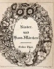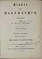 ![]() عنوان صفحهٔ نخست از چاپ اول' داستانهای کودکان و خانواده (۱۸۱۹). | |