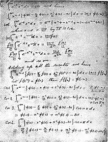 صفحه ای از دفترچه یادداشت رامانوجان که در آن قضیه اصلی خود را بیان کردهاست.