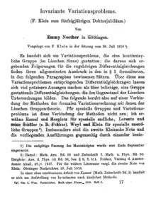 - Noether, E. (1918). "Invariante Variationsprobleme". Nachrichten von der Gesellschaft der Wissenschaften zu Göttingen. Mathematisch-Physikalische Klasse. 1918: 235–257.