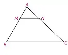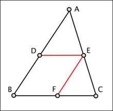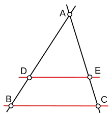 اگر ضلعهای مثلثی به یک نسبت بریده شده باشند، خط راست واصل بین نقطههای بریدگی با ضلع سوم موازی است.