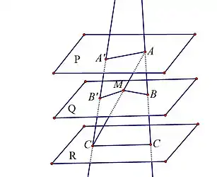 با فرض آن که صفحه Q بین دو صفحه P و R قرار دارد، خط 'AC را رسم میکنیم. این خط صفحه Q را در نقطه ای مانند M قطع میکند. صفحه شامل دو خط متقاطع AC و 'AC را T و صفحه گذرنده از دو خط متقاطع 'AC و 'A'C را S مینامیم، داریم: صفحه T دو صفحه موازی Q و R را قطع کردهاست، بنابراین فصل مشترکها موازی هستند یعنی 'BM||CC، در نتیجه در مثلث 'ACC با توجه به قضیه تالس میتوان نوشت: