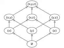 کاردینال مجموعه ، سه است در حالی که در مجموعه توانی آن 8 عضو وجود دارد ()، در اینجا ترتیب براساس رابطه زیرمجموعگی می باشد.