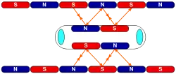 در سامانه تعلیق الکترودینامیکی (EDS)، هر دو مسیر راهنما و قطار یک میدان مغناطیسی اعمال میکنند و قطار توسط نیروی دافعه و جذب بین این میدانهای مغناطیسی معلق میشود.[10] در برخی از چیدمانها، قطار تنها با نیروی دافعه قابل حرکت است. برخلاف سامانههای جدید EDS که دافعهای جذبی هستند، در مراحل اولیه توسعه مگلو در مسیر آزمایشی میازاکی، از یک سامانه کاملاً دافعهای استفاده شده بود.[11] میدان مغناطیسی یا توسط آهنرباهای ابررسانا (مانند JR-Maglev) یا با آرایهای از آهنرباهای دائمی (مانند Inducrack) تولید میشود. نیروی دافعه و جذب در مسیر توسط یک میدان مغناطیسی القایی در سیمها یا نوارهای رسانای دیگر در مسیر ایجاد میشود.